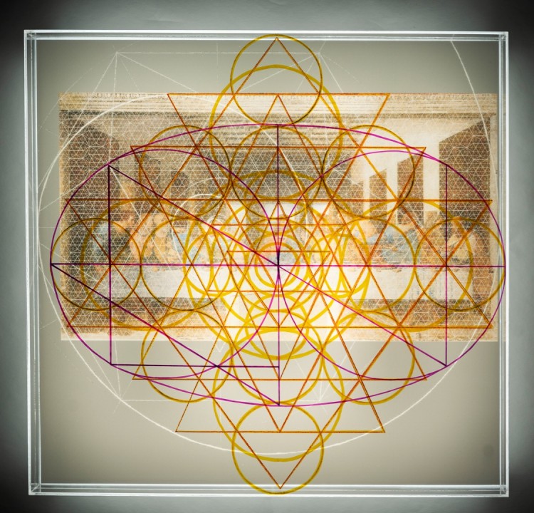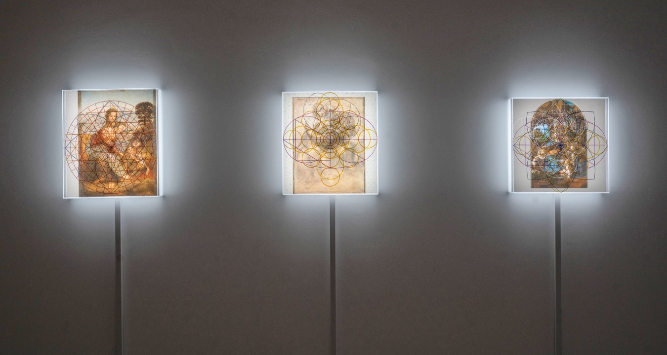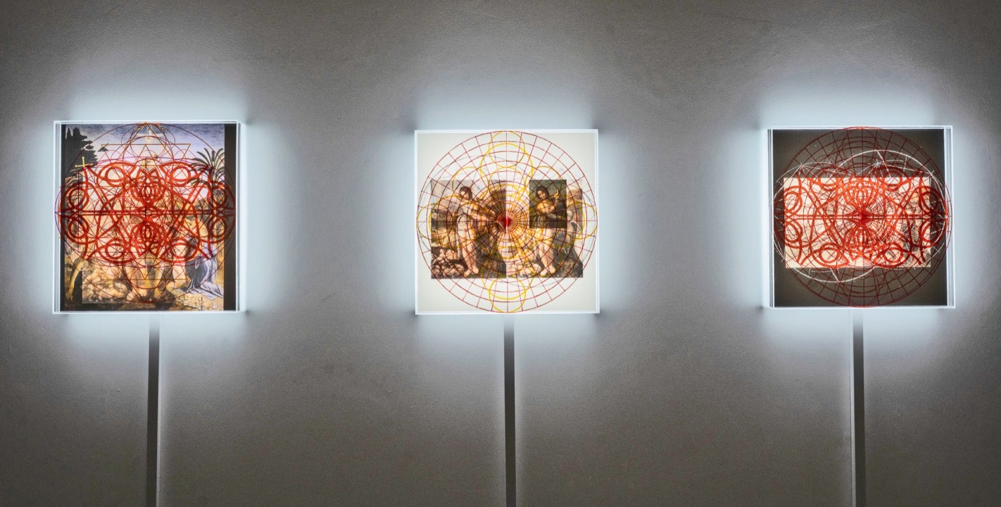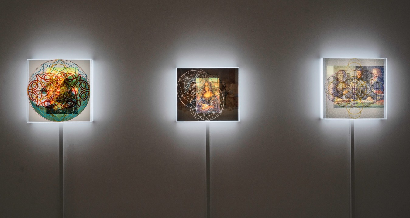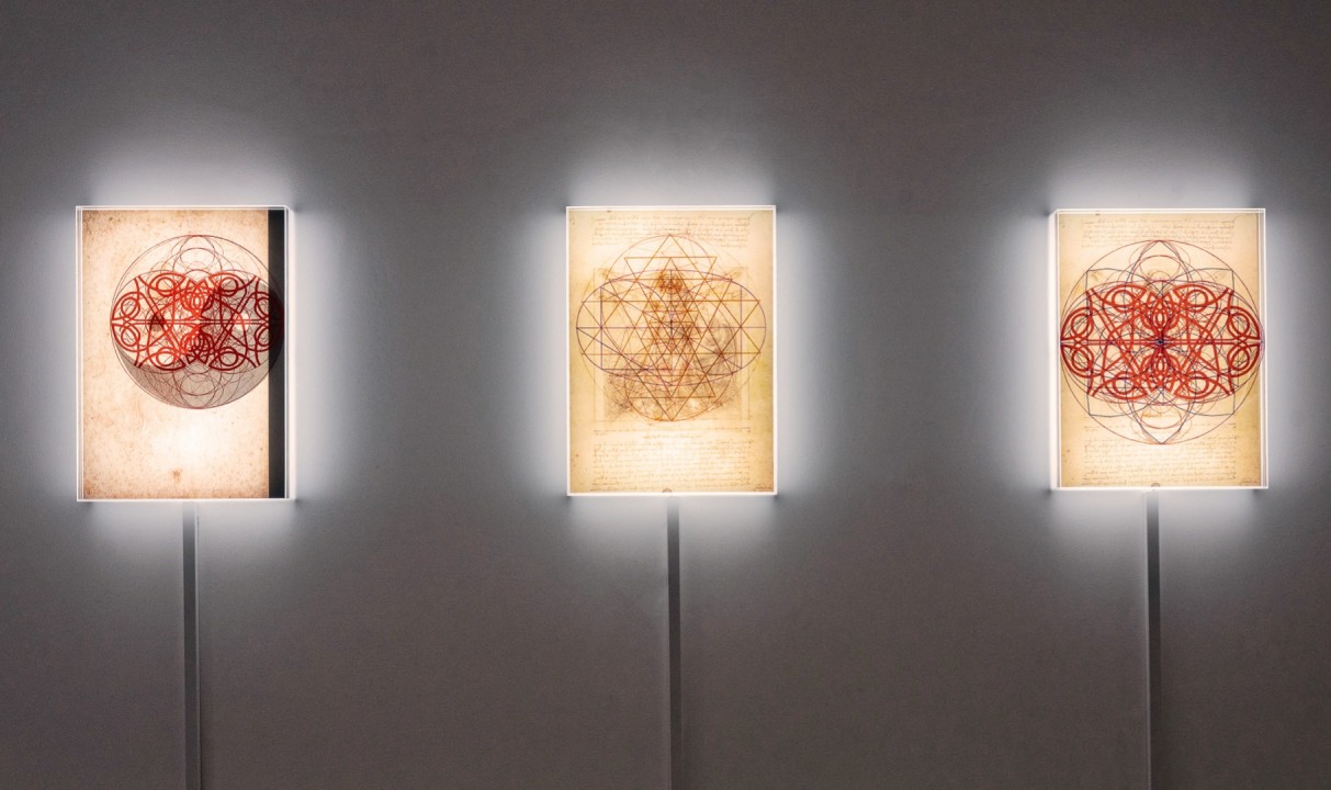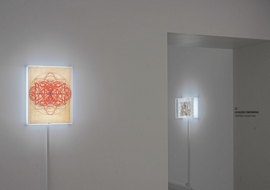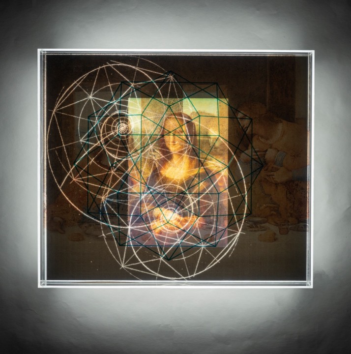 "The project’s starting points are some of the most iconic paintings and drawings by Leonardo da Vinci (1452-1519) – The Last Supper, Mona Lisa, Saint John the Baptist, Virgin of the Rocks, among other lesser-known works –, from where the artist deconstructs geometric propositions existing in a collective unconscious. Using a scientific, artistic, and religious methodology and through in-depth investigative knowledge in detailed symbology study, the presented works moreover, question our own way of grasping the world by analysing an innate internal structure. In this sense, immutable signs are understood in changing contexts, namely social, political, cultural or temporal, which go beyond the symbols fixed meanings. By dropping its signifying anchor, symbols reveal an incidental formalism, or a combinatorial chain of meanings, dependent on human sensibility translating into a set of ideas, emotions and languages common to all societies.