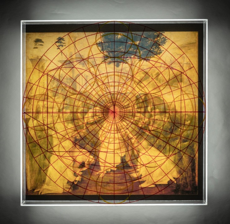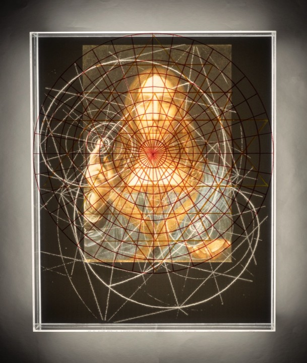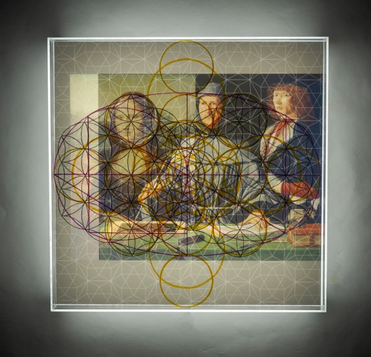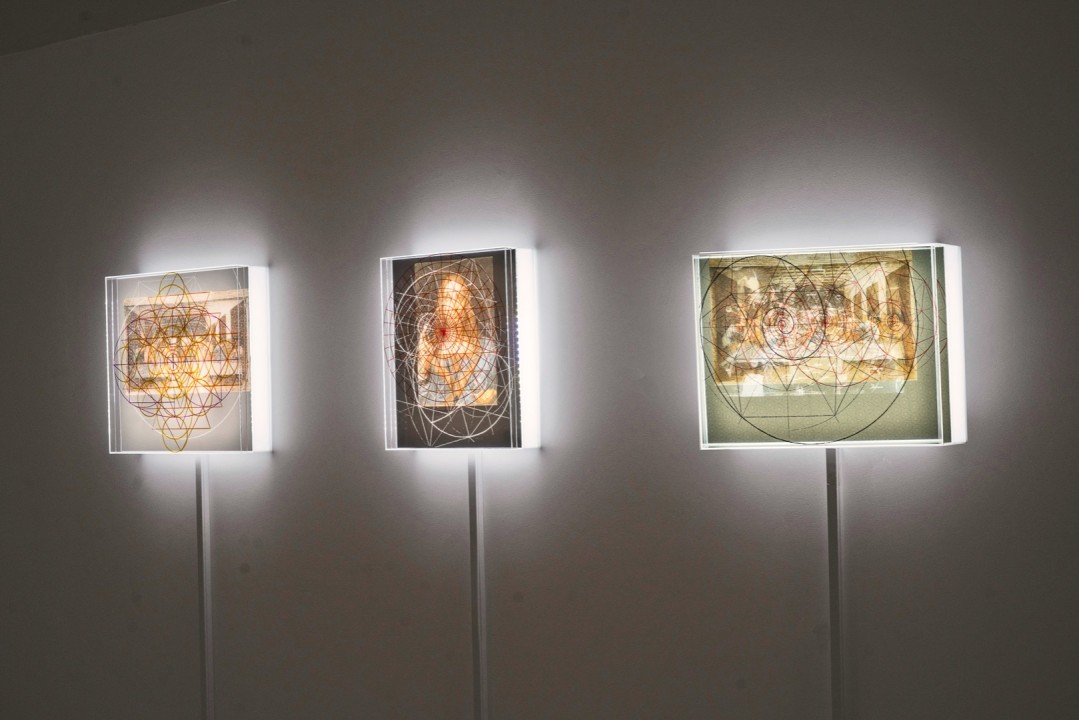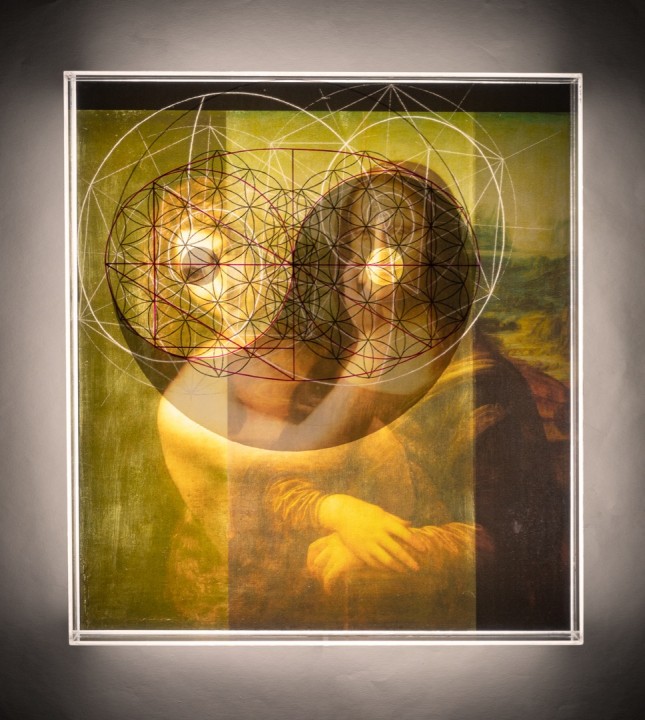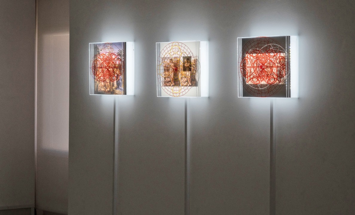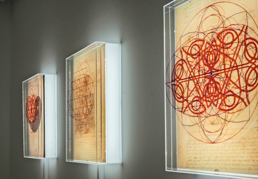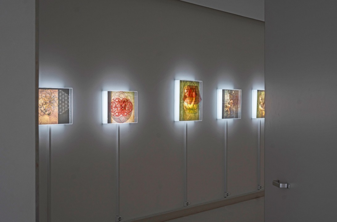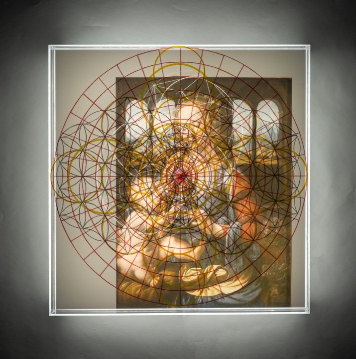 "The project’s starting points are some of the most iconic paintings and drawings by Leonardo da Vinci (1452-1519) – The Last Supper, Mona Lisa, Saint John the Baptist, Virgin of the Rocks, among other lesser-known works –, from where the artist deconstructs geometric propositions existing in a collective unconscious. Using a scientific, artistic, and religious methodology and through in-depth investigative knowledge in detailed symbology study, the presented works moreover, question our own way of grasping the world by analysing an innate internal structure. In this sense, immutable signs are understood in changing contexts, namely social, political, cultural or temporal, which go beyond the symbols fixed meanings. By dropping its signifying anchor, symbols reveal an incidental formalism, or a combinatorial chain of meanings, dependent on human sensibility translating into a set of ideas, emotions and languages common to all societies.