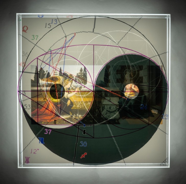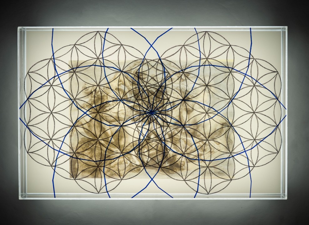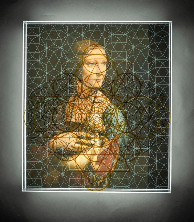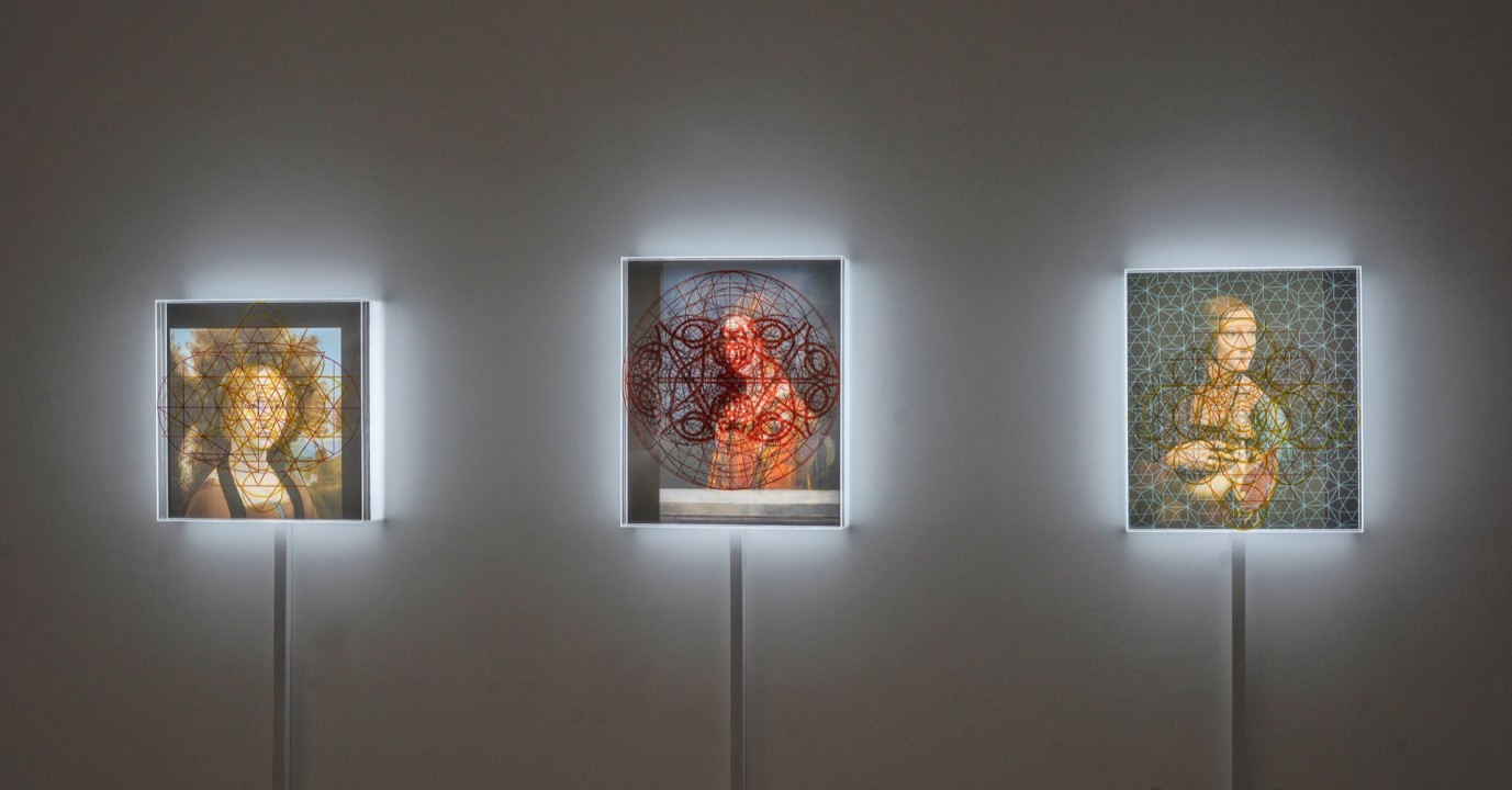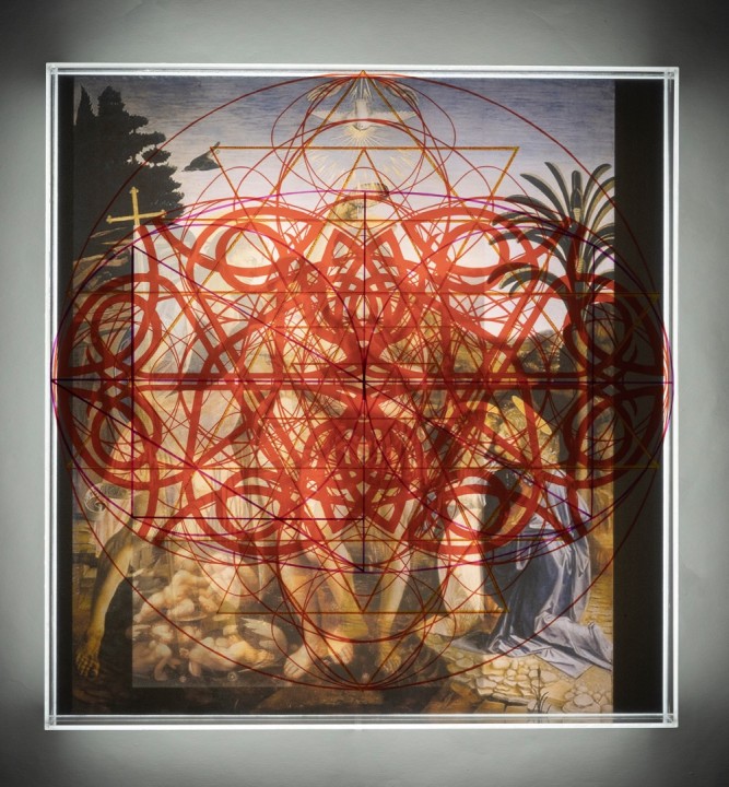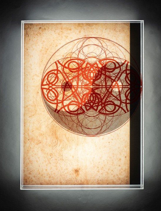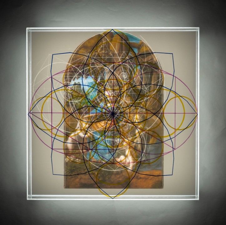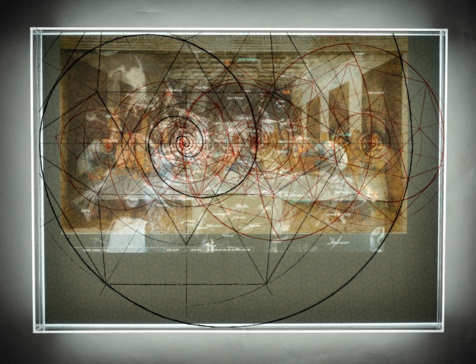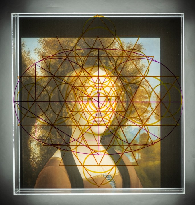 "The project’s starting points are some of the most iconic paintings and drawings by Leonardo da Vinci (1452-1519) – The Last Supper, Mona Lisa, Saint John the Baptist, Virgin of the Rocks, among other lesser-known works –, from where the artist deconstructs geometric propositions existing in a collective unconscious. Using a scientific, artistic, and religious methodology and through in-depth investigative knowledge in detailed symbology study, the presented works moreover, question our own way of grasping the world by analysing an innate internal structure. In this sense, immutable signs are understood in changing contexts, namely social, political, cultural or temporal, which go beyond the symbols fixed meanings. By dropping its signifying anchor, symbols reveal an incidental formalism, or a combinatorial chain of meanings, dependent on human sensibility translating into a set of ideas, emotions and languages common to all societies.