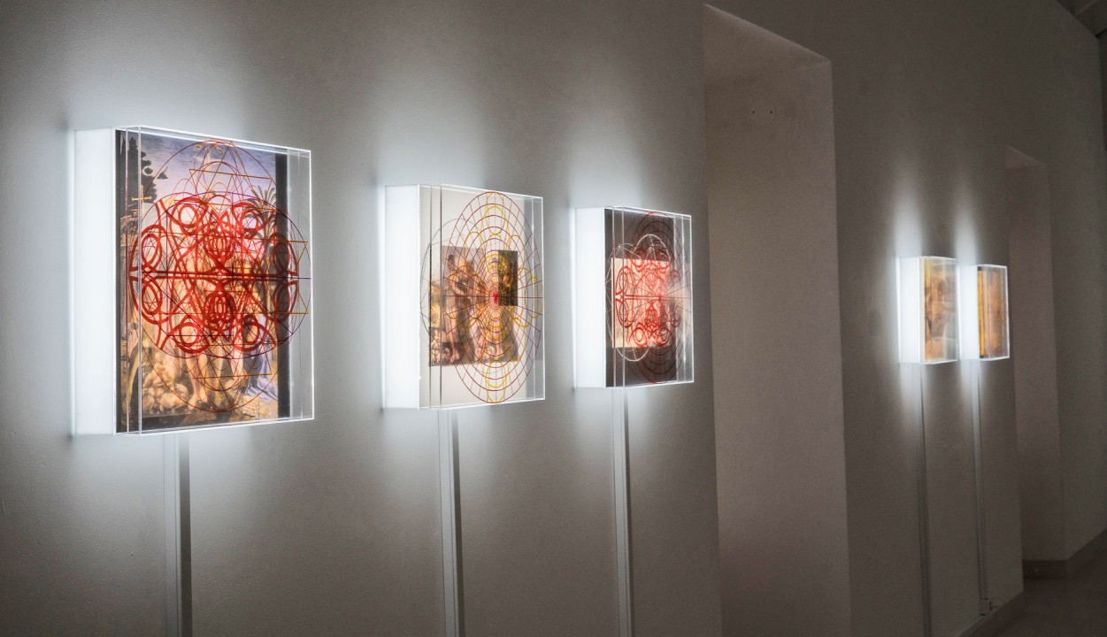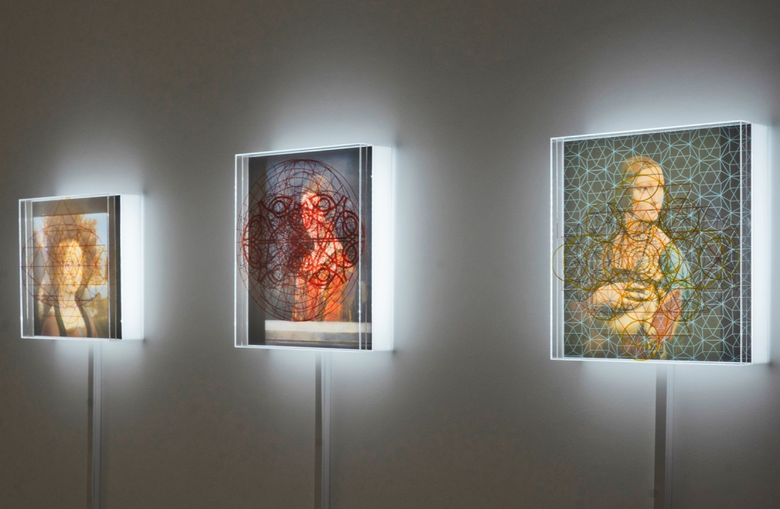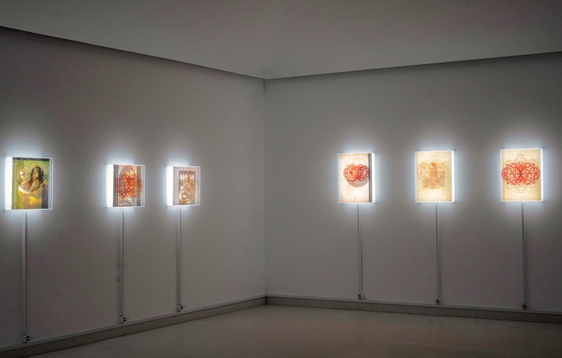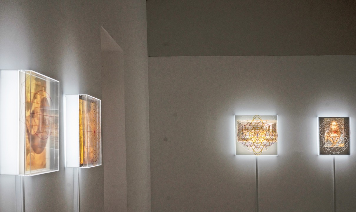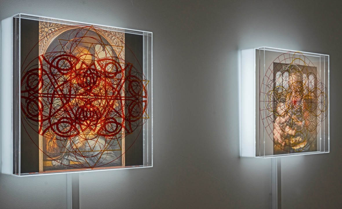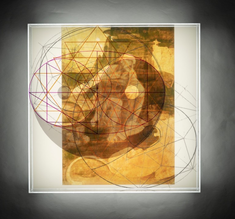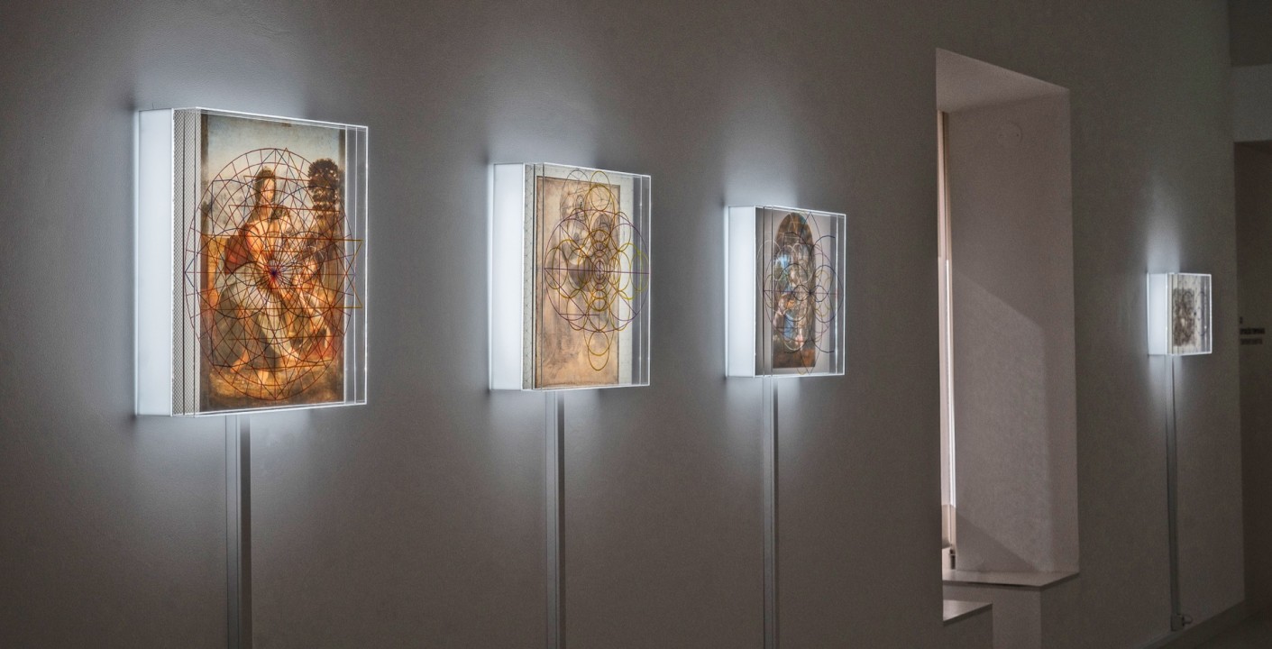 "The project’s starting points are some of the most iconic paintings and drawings by Leonardo da Vinci (1452-1519) – The Last Supper, Mona Lisa, Saint John the Baptist, Virgin of the Rocks, among other lesser-known works –, from where the artist deconstructs geometric propositions existing in a collective unconscious. Using a scientific, artistic, and religious methodology and through in-depth investigative knowledge in detailed symbology study, the presented works moreover, question our own way of grasping the world by analysing an innate internal structure. In this sense, immutable signs are understood in changing contexts, namely social, political, cultural or temporal, which go beyond the symbols fixed meanings. By dropping its signifying anchor, symbols reveal an incidental formalism, or a combinatorial chain of meanings, dependent on human sensibility translating into a set of ideas, emotions and languages common to all societies.