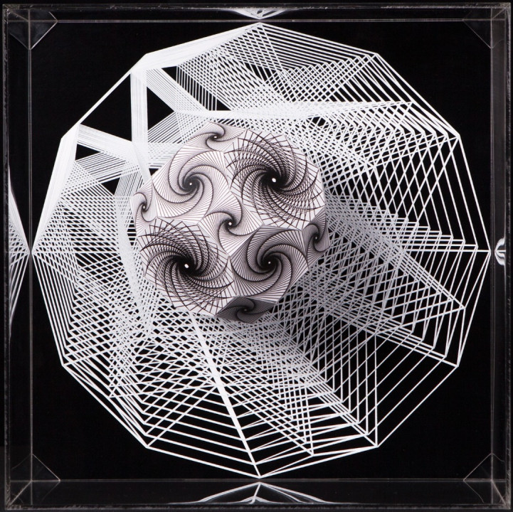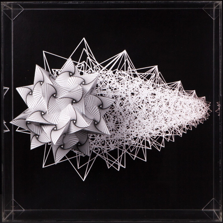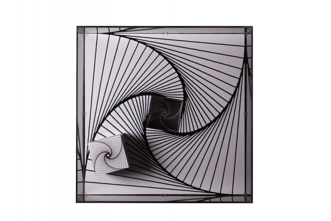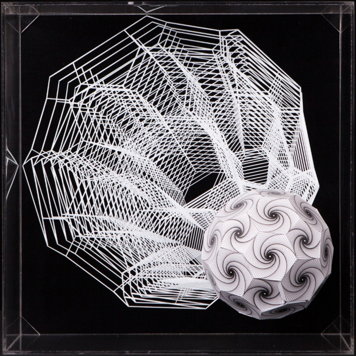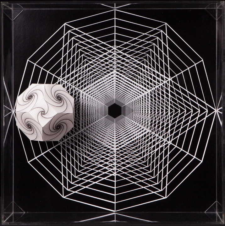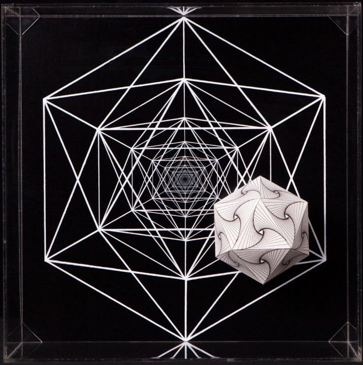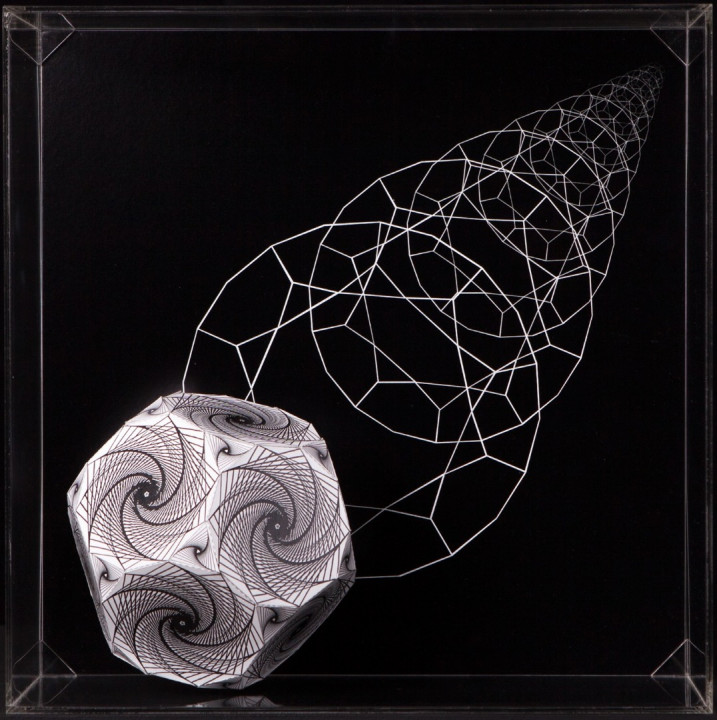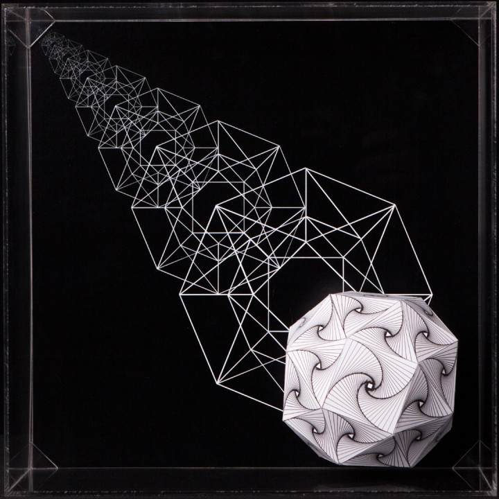 Thus Hyperbolic Hyparxis uses a stream of multiple hyperbolic optical illusions structured as a rhizomatic polyhedral system (hyparxis). These polyhedra are deconstructed into seemingly Calabi-Yau manifolds, which are described in certain branches of mathematics such as algebraic geometry. The Calabi-Yau manifolds’ properties, such as Ricci flatness, also yield applications in theoretical physics. Particularly in superstring theory, the extra dimensions of spacetime are sometimes thought to take the form of a 6-dimensional Calabi-Yau manifold, which led to the idea of mirror symmetry amongst these types of spaces.